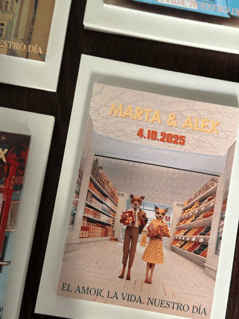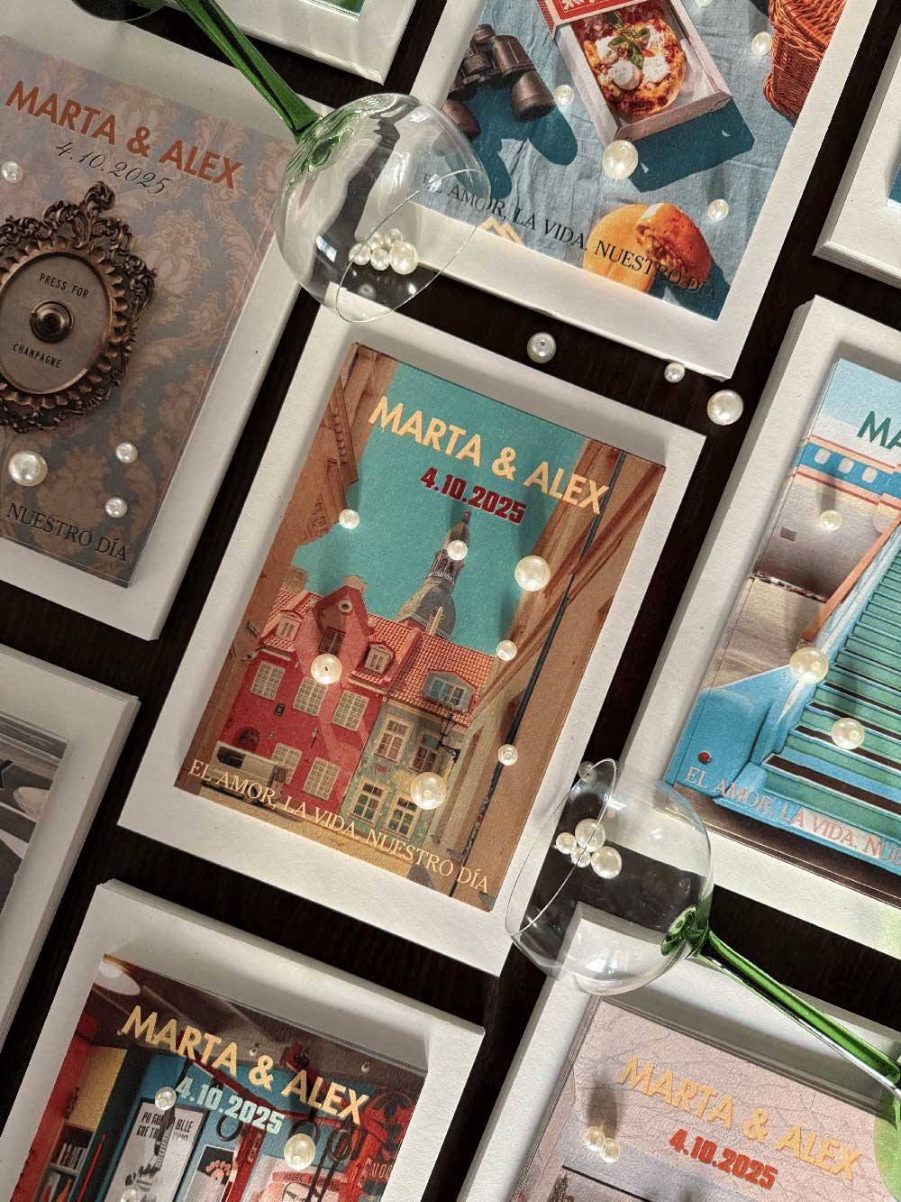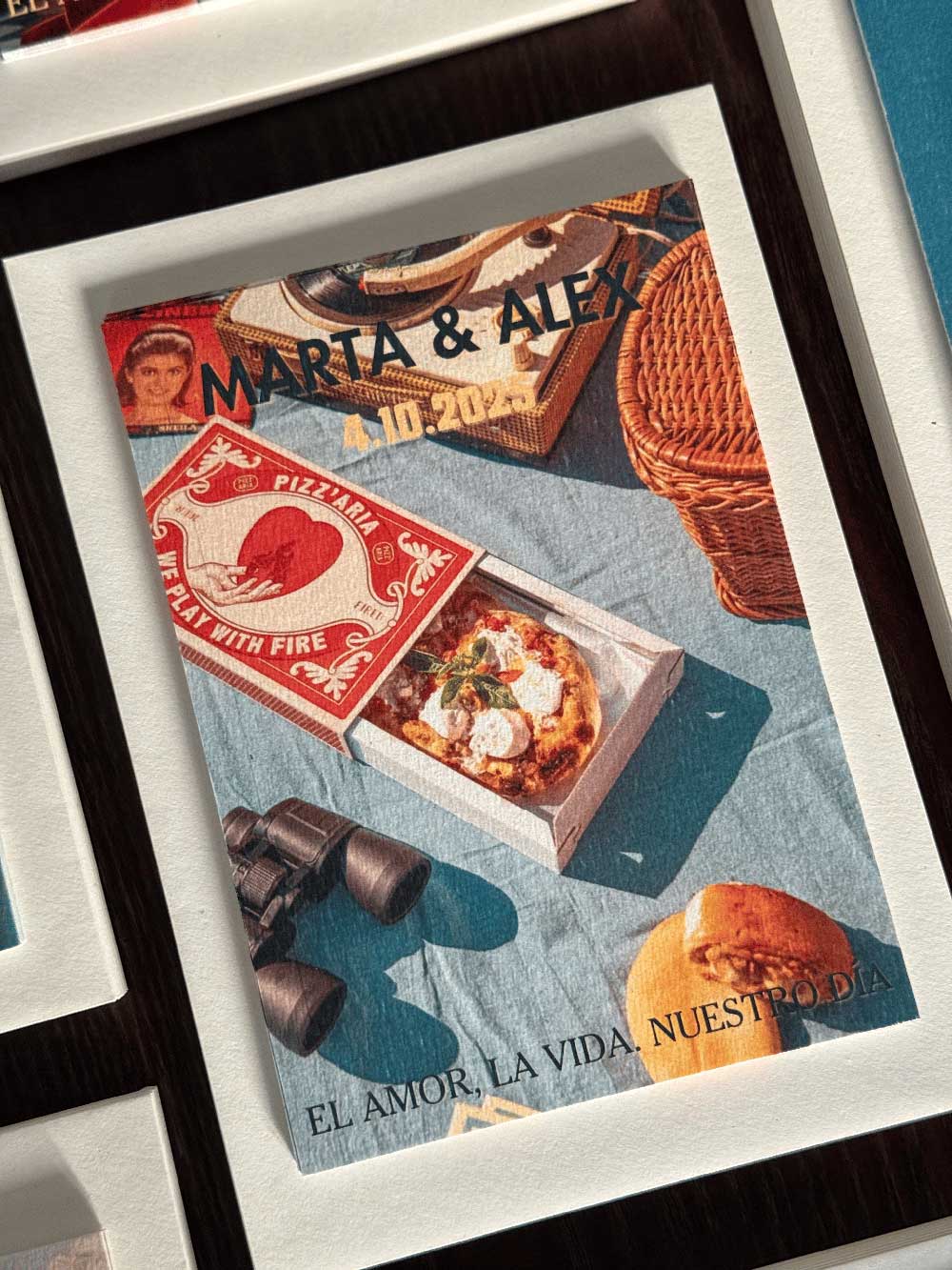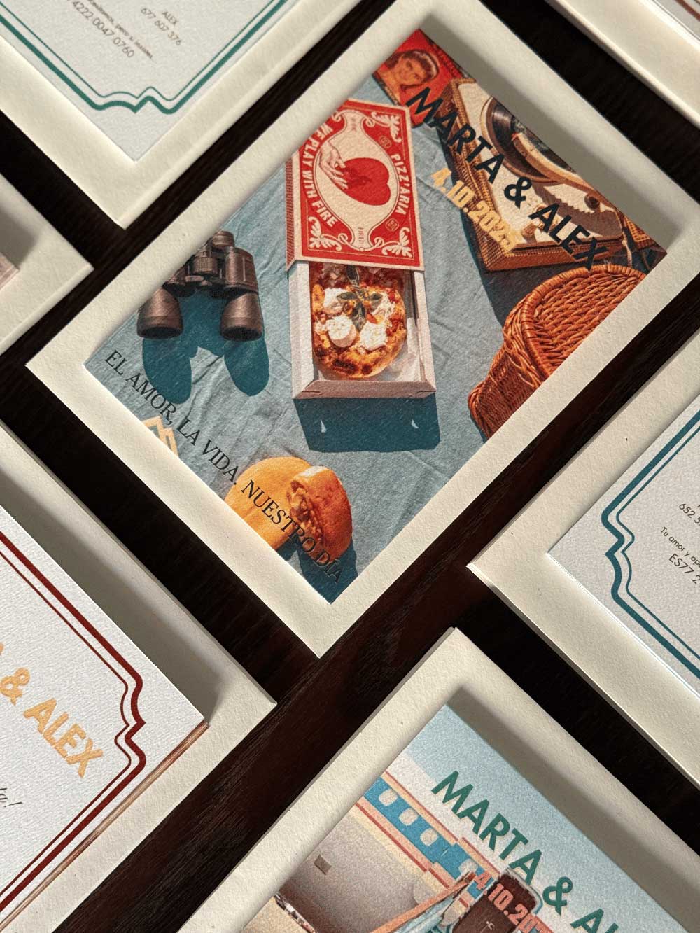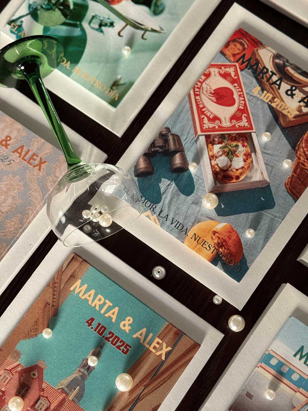 Olvídate de lo convencional. Estas invitaciones son una declaración de intenciones para parejas que ven la vida a todo color. Con un diseño estilo collage vibrante y una estética vintage cinematográfica, esta papelería captura la esencia de ‘La Dolce Vita’. Detalles dorados en la tipografía, imágenes eclécticas (pizzas, binoculares, arquitectura clásica) y una paleta de colores saturados crean una invitación que tus invitados querrán enmarcar. ¡Perfectas para bodas divertidas, urbanas o con temática retro!